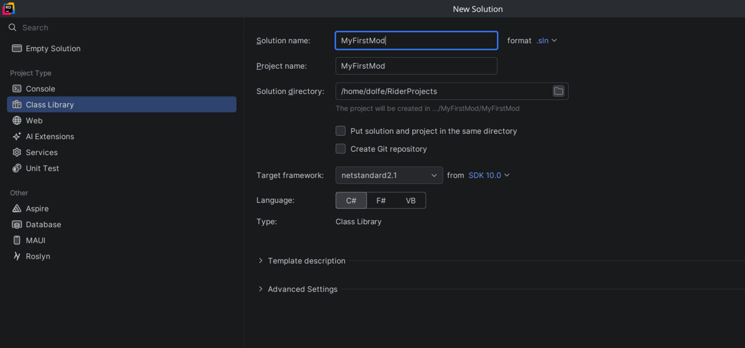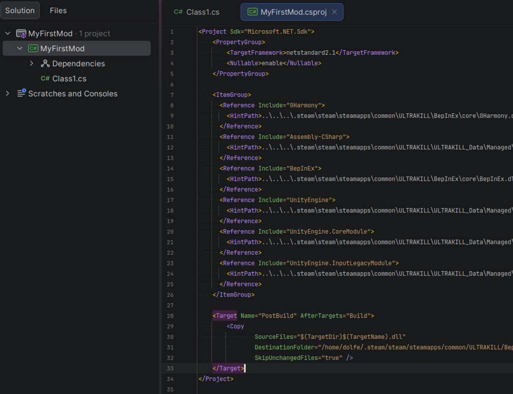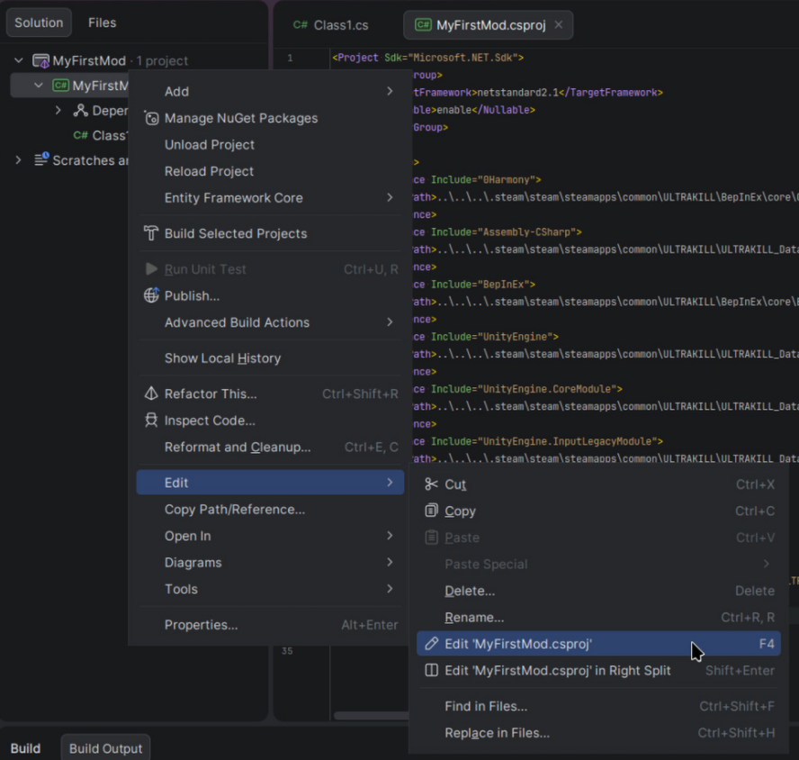 .dllwill be output tobin/Debug/netstandard2.1/MyFirstMod.dllinside your project folder. - Copy the