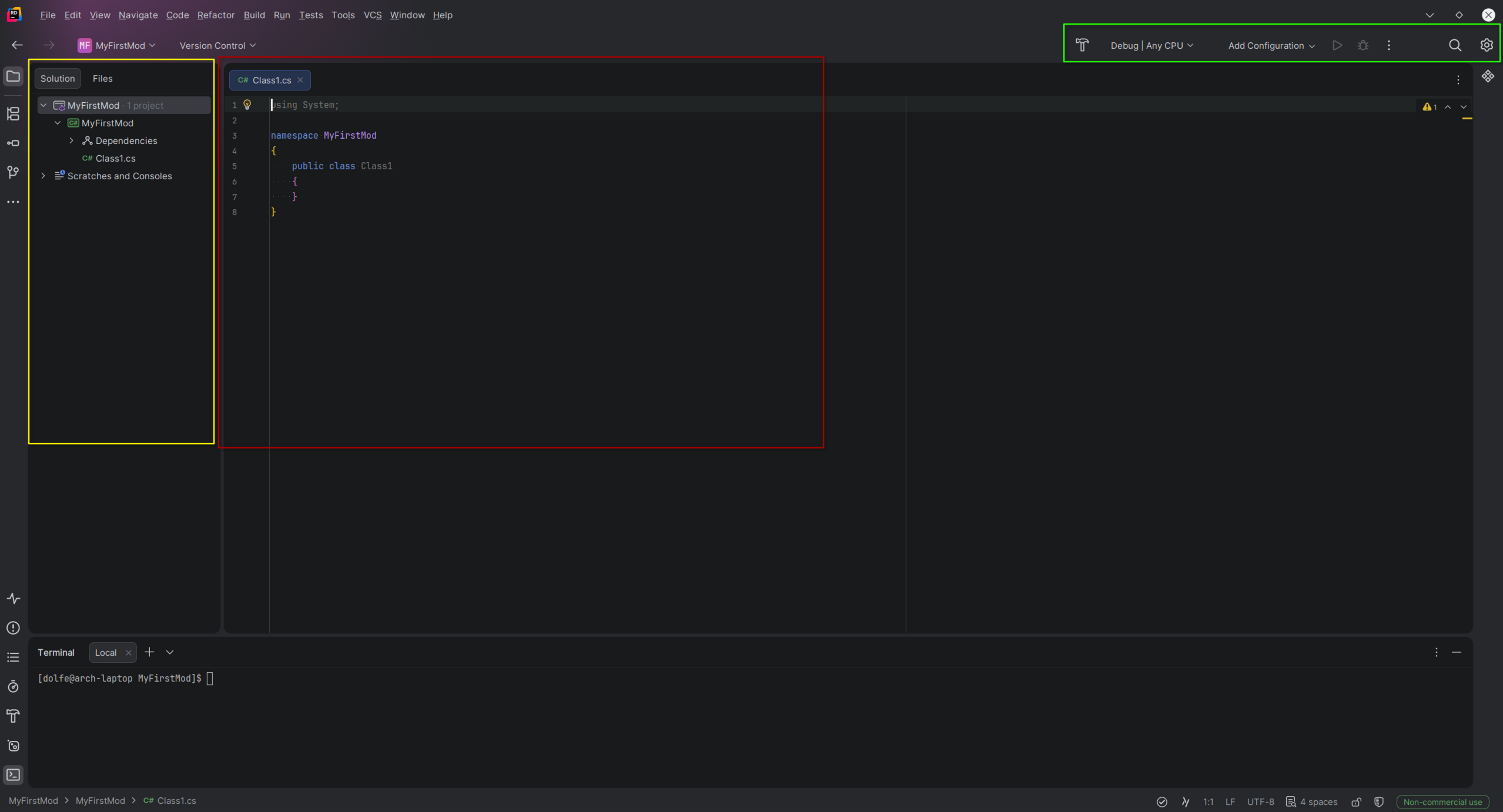 - Build the project — In Rider, Press the hammer (In the Green Box Shown here). If there are no errors, your